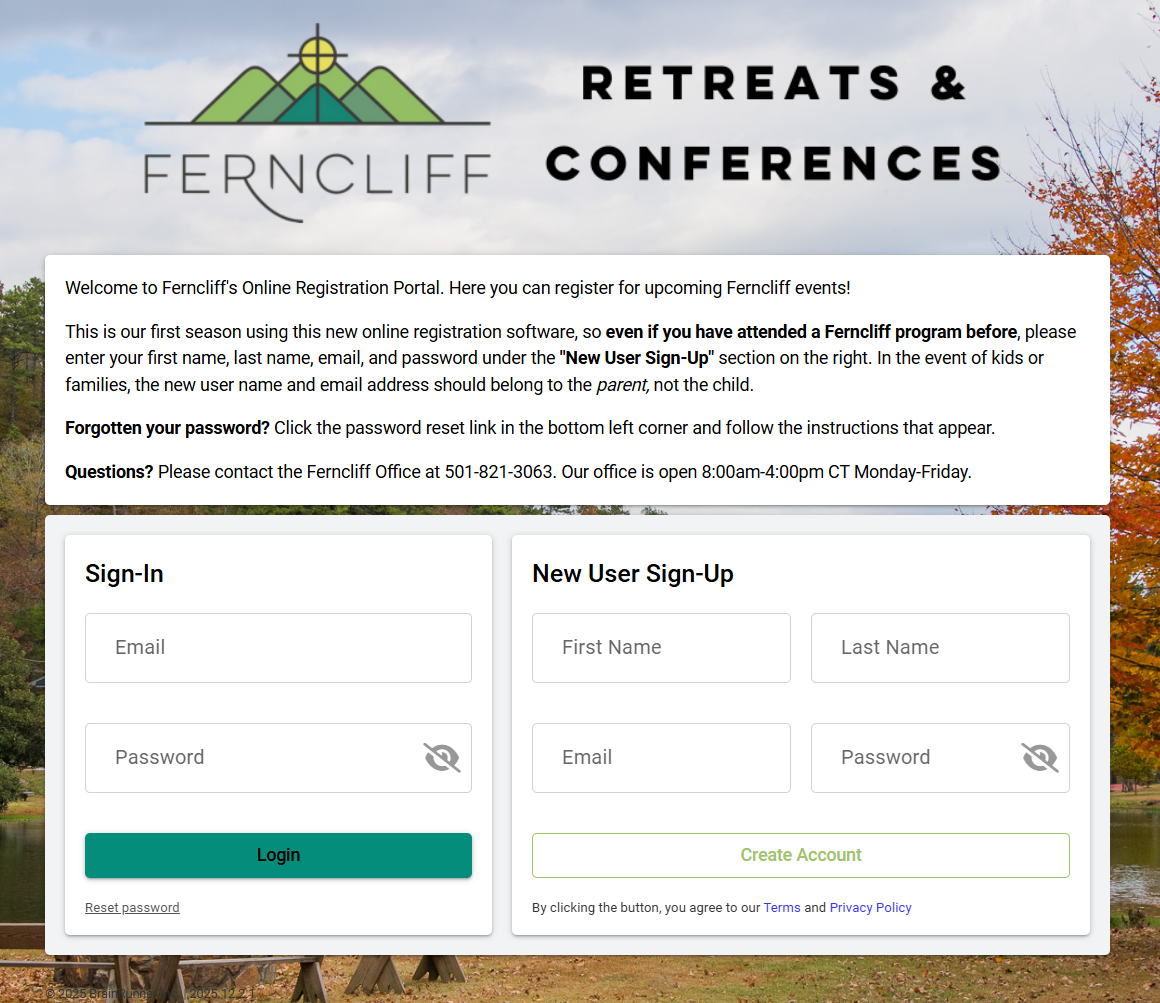 This is our first season using this new online registration software, so even if you have attended a Ferncliff program before, please enter your first name, last name, email, and password under the “New User Sign-Up” section on the right.
